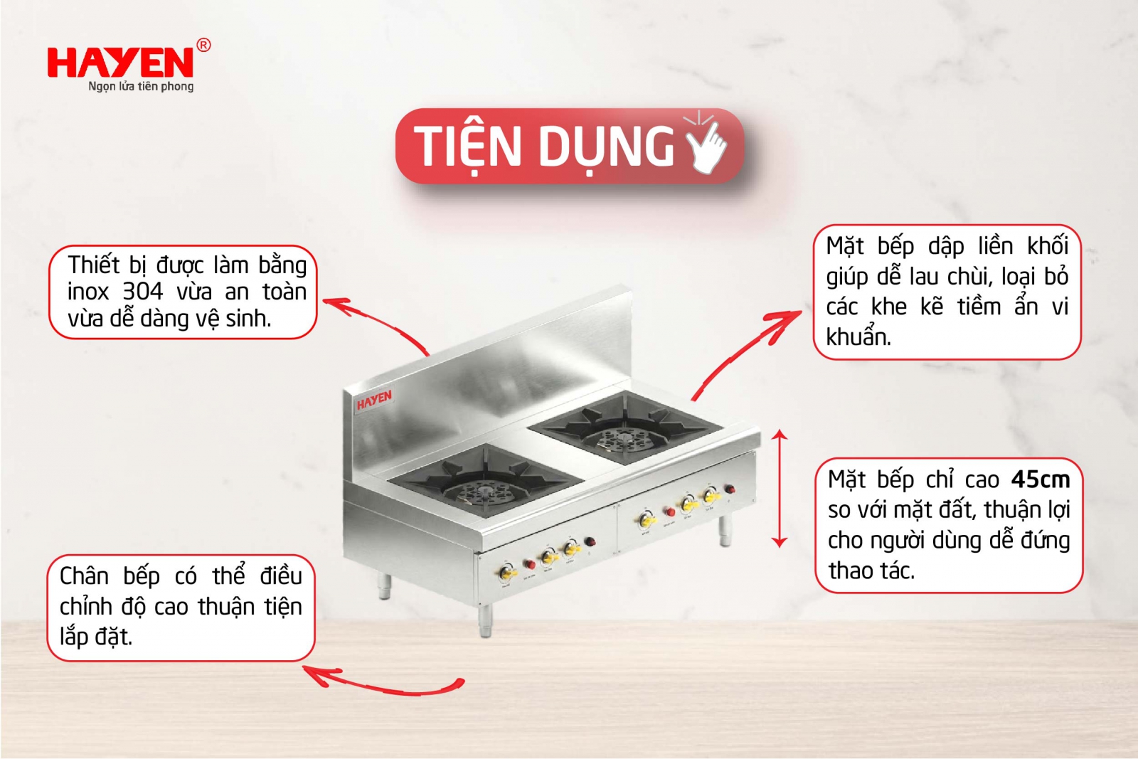 - Mặt bếp chỉ cao so với mặt đất khoảng 45cm, thuận lợi cho người dùng dễ đứng thao tác khi khuấy, đảo thực phẩm trong nồi.