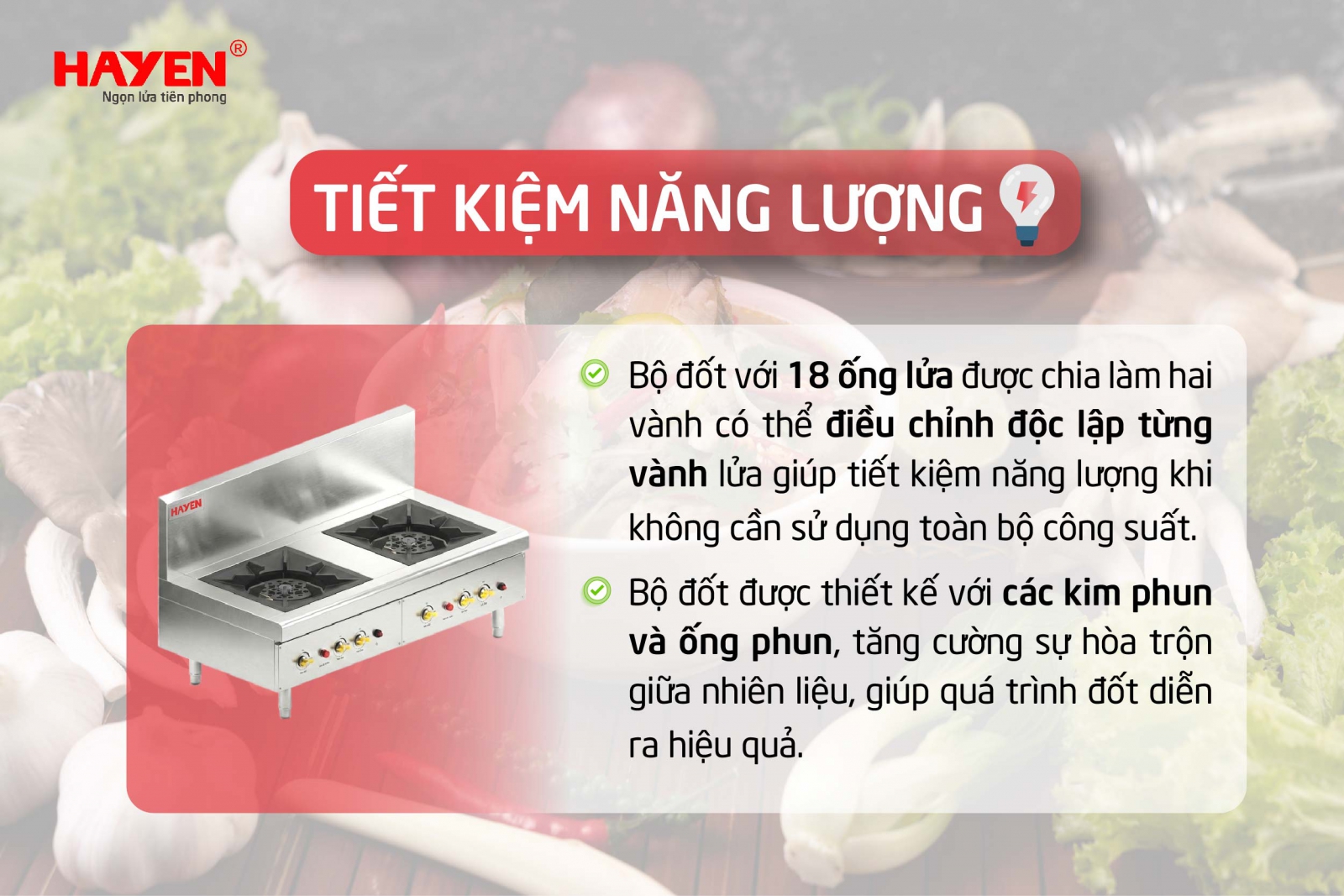- Bộ đốt với 18 ống lửa được chia làm hai vành giúp người sử dụng có thể điều chỉnh độc lập từng vành lửa, từ đó dễ dàng tùy chỉnh mức nhiệt theo nhu cầu sử dụng thực tế. Điều này không chỉ giúp tiết kiệm năng lượng khi không cần sử dụng toàn bộ công suất, mà còn tối ưu hóa quá trình nấu nướng một cách hiệu quả hơn.