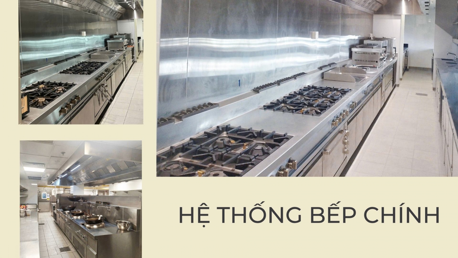 Hệ thống bếp chính được thiết kế và lắp đặt đồng bộ, tối ưu hóa quy trình bếp một chiều, đáp ứng nhu cầu phục vụ hàng nghìn thực khách cùng lúc tại nhiều nhà hàng, sảnh tiệc khác nhau trong cùng một khu nghỉ dưỡng.