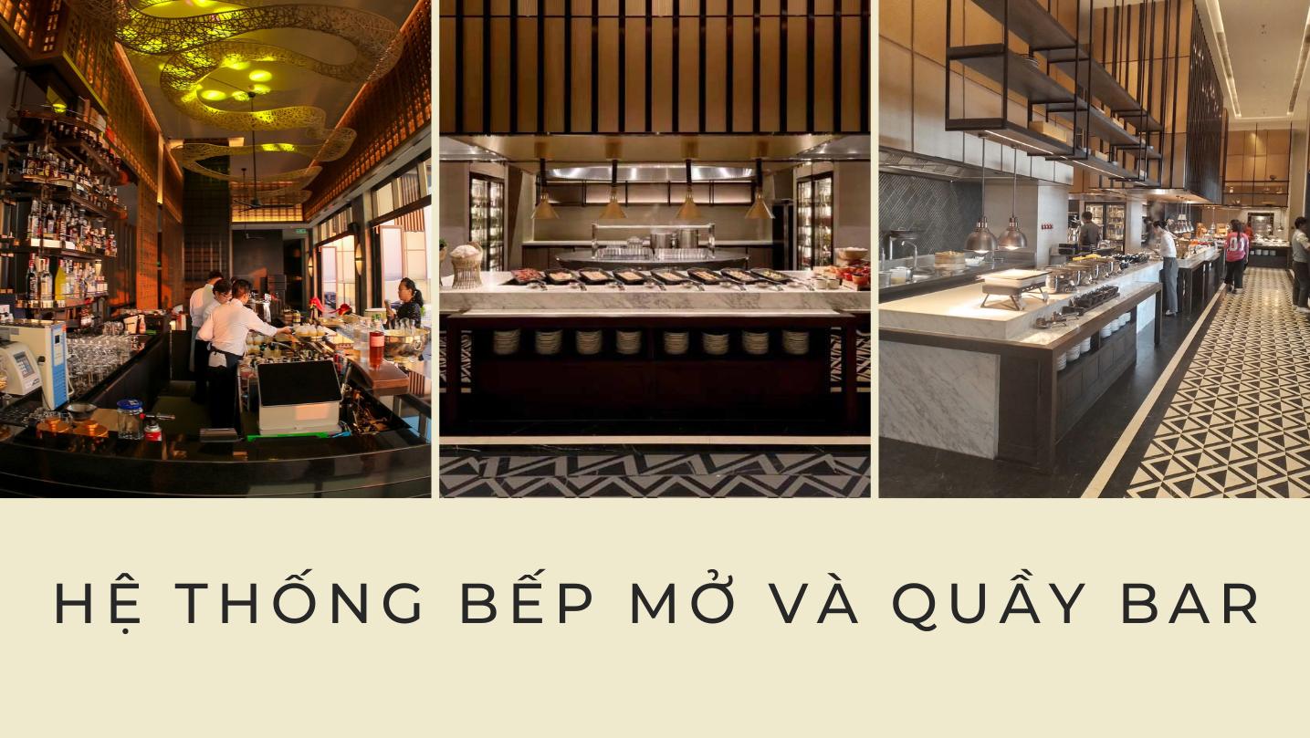 Thiết bị bếp chuyên dụng cho từng nhà hàng và quầy bar được lựa chọn phù hợp với đặc thù từng phong cách ẩm thực riêng biệt — từ bếp Nhật tinh tế tại Roku, khu chế biến hải sản tươi sống tại Marina Kitchen cho đến thiết bị pha chế chuyên nghiệp tại Del Mar và The Vue.